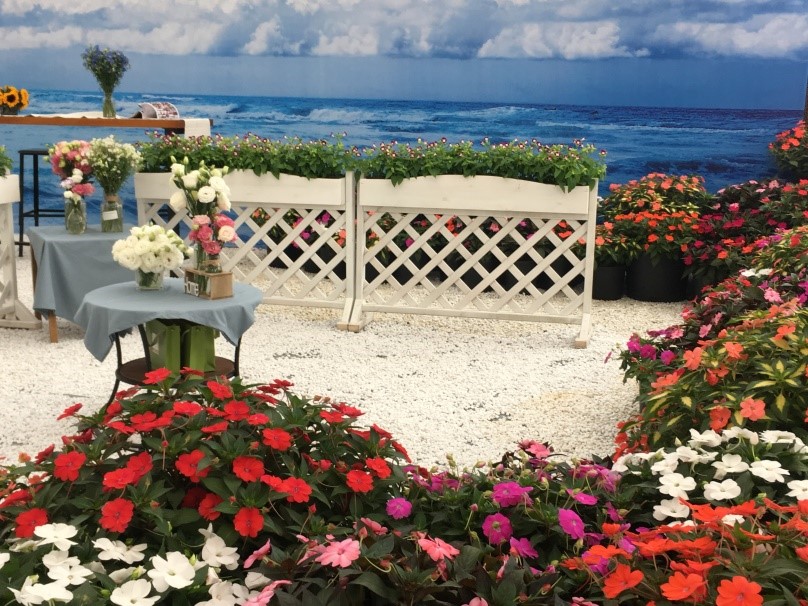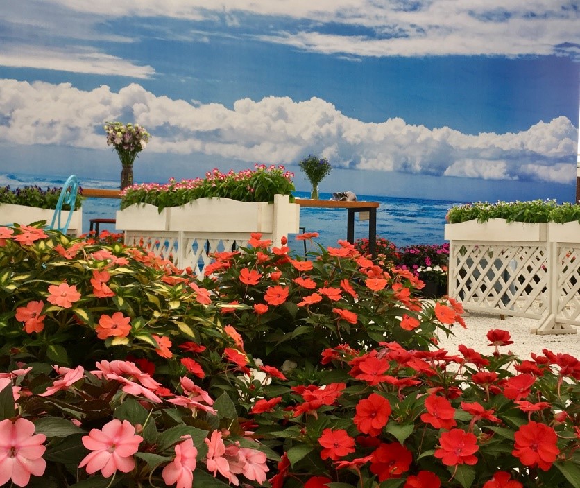 在坂田公司的展位上,我們主打“桑蓓斯®”的盆栽組合應用,采用藍天白云,細石白沙為背景,為參觀者營造出在海邊漫步,被鮮花簇擁的浪漫氛圍。在室外,也大量種植了桑蓓斯,采用已有的多個花色進行組合,達到室內外相互呼應的效果。
