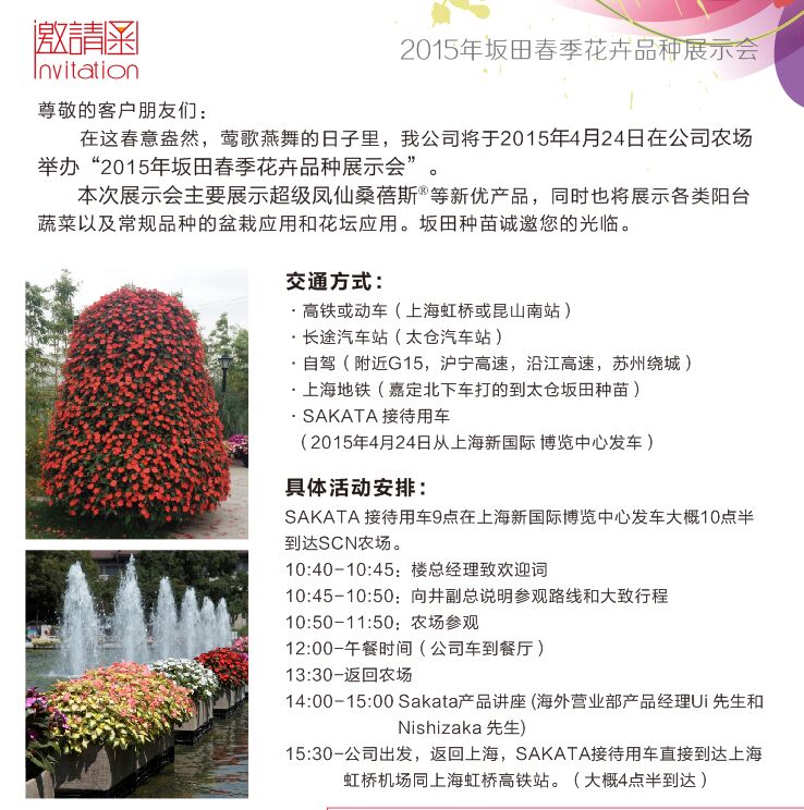 尊敬的客戶朋友們: 在這春意盎然,鶯歌燕舞的日子里,我公司將于2015年4月24日在公司農場舉辦“2015年坂田春季花卉品種展示會”。本次展示會主要展示超級鳳仙桑蓓斯®等新優產品,同時也將展示各類陽臺蔬菜以及常規品種的盆栽應用和花壇應用。坂田種苗誠邀您的光臨。
