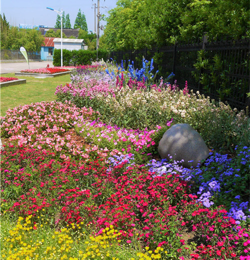 進入坂田種苗(蘇州)有限公司的大門,便可見右側大花壇運用花境設計方式種植了許多花卉品種,主要有紫羅蘭“四重奏”系列、藿香薊“藍色視野”、黃金菊“閃亮”、冰島虞美人“仙境”、銀蓮花“和諧”、大花飛燕草“燭光”系列、石竹“鉆石”系列、風鈴草“超級冠軍”系列和“冠軍”系列。
