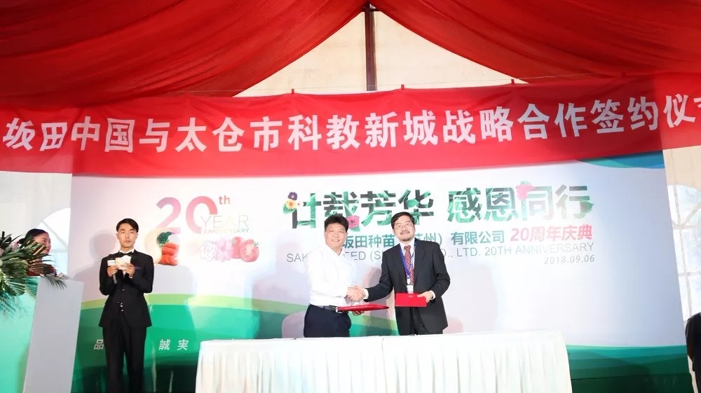 坂田中國(guó)與太倉(cāng)市科教新城簽訂戰(zhàn)略合作關(guān)系,坂田種苗(蘇州)有限公司副董事長(zhǎng)兼總經(jīng)理樓惠寶以及太倉(cāng)市科教新城黨工委書(shū)記陸定峰出席簽約