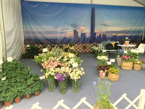 坂田花卉展位,以都市與自然為主題打造了一個(gè)幽靜的天空花園,都市是借用了深圳的城市圖,作為花園的主體背景;