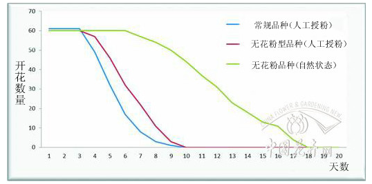 早在之前,坂田以及其他花卉育種公司都曾研究并試圖確定通過去花粉技術可以使鮮花的壽命提高的問題。經過試驗表明,植物的一些生理特性會導致鮮切花在經過授粉后,瓶插期會縮短的現象。夏季溫度高,鮮花的瓶插期會大大縮短,而無花粉型雌蕊不產生花粉,因此沒有授粉過程,整個壽命會大大提高,因此這個優勢在夏季尤為凸顯。新型的無花粉型鮮花在夏季運輸過程中有著出色的表現,這一特點對于鮮切花來說非常重要,它可以為消費者提供更長時間可以欣賞到洋桔梗鮮花的機會。