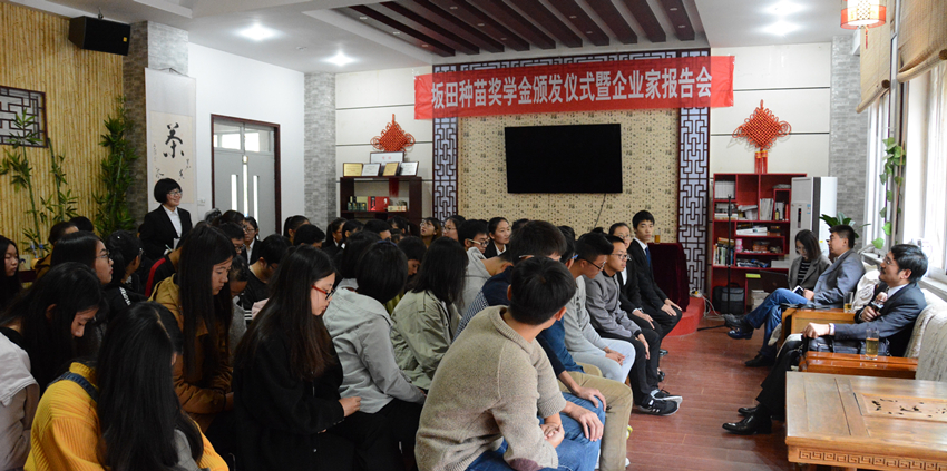 ? ? ? ?隨后,坂田種苗副董事長兼總經理樓惠寶先生與參加頒獎儀式的全體學生進行了精彩的報告會。會上樓惠寶副董事長兼總經理就學生關心的社會就業形勢、農業行業的薪酬狀況、企業對應屆畢業生的要求等方面作了報告。并與學生對就業等大家關心的事項進行了意見交換。